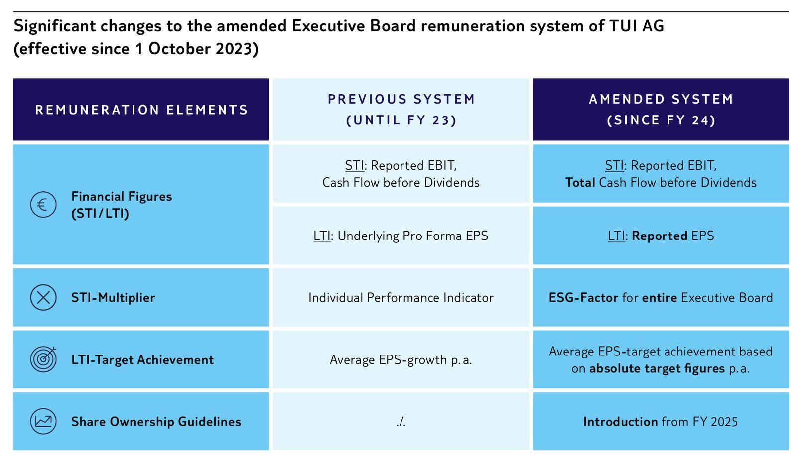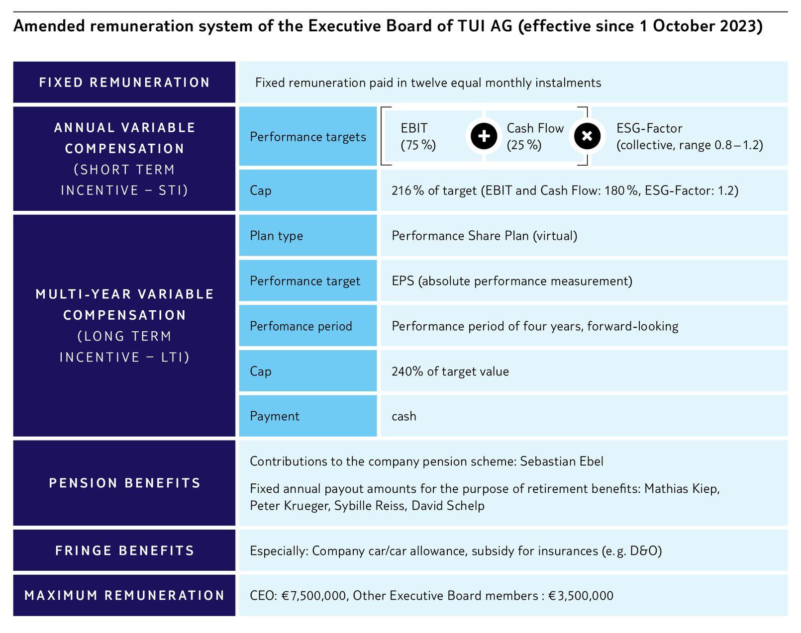 The current remuneration system for the members of TUI AG's Executive Board has been in place since financial year 2024 (beginning 1 October 2023) and was retroactively approved by the Annual General Meeting on 13 February 2024 with a majority of 88.94%.