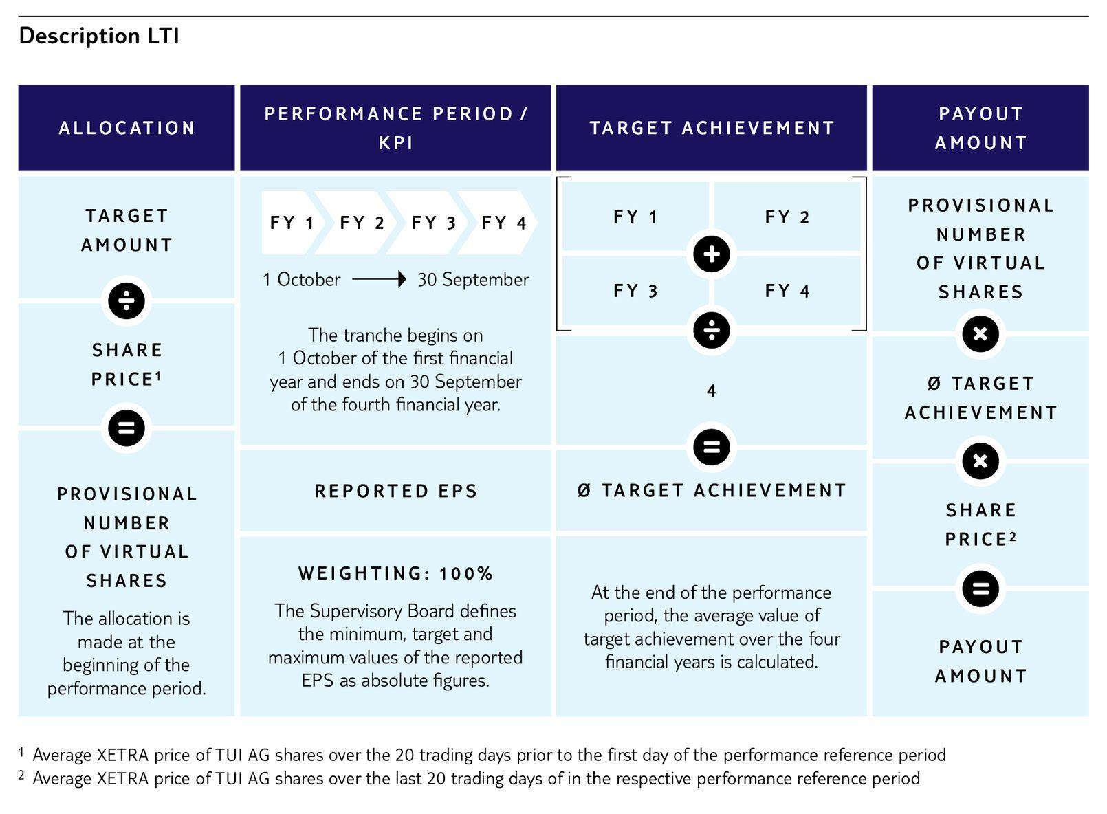 The LTI is a multi-year variable remuneration for Executive Board members calculated on the basis of virtual shares. The relevant performance target is the TUI Group's average annual reported earnings per share (EPS) over a four-year performance period.