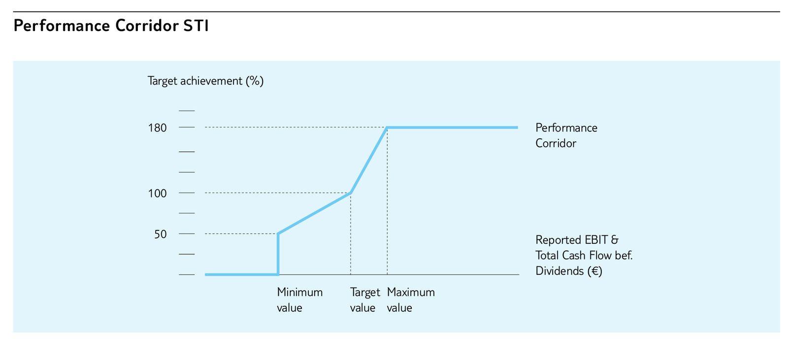 Payments from the STI are only granted if targets are achieved within the target achievement corridor. The degree of target achievement resulting from the weighted average calculation is multiplied by the ESG factor and the individual target amount agreed in the service agreement in order to calculate the amount paid out for the STI.