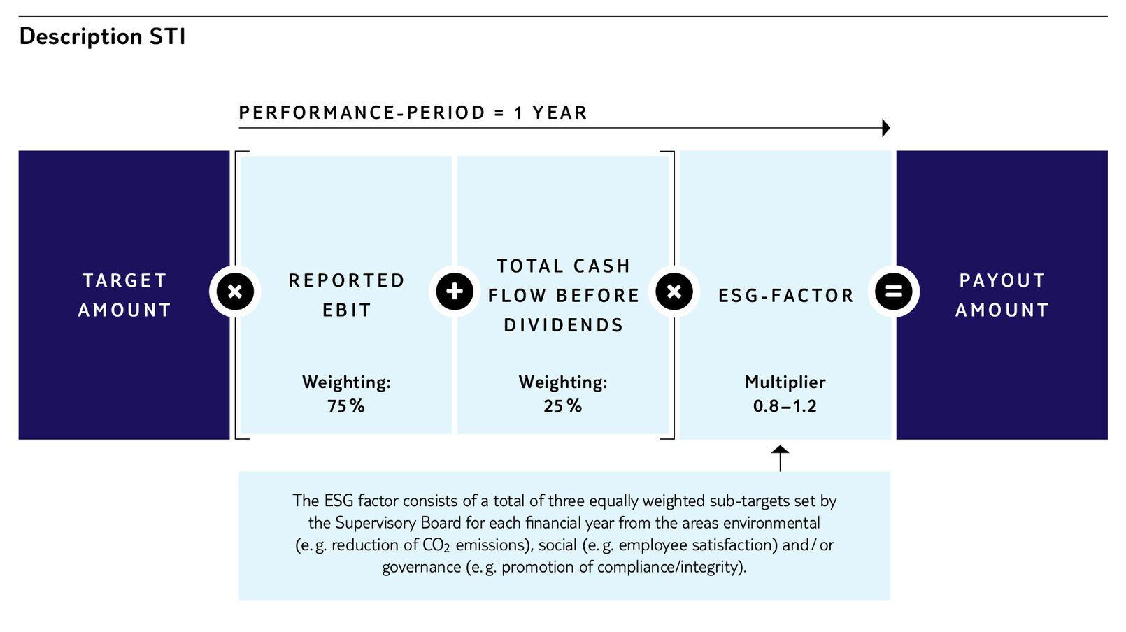 The performance-related components of Executive Board remuneration include the annual performance-related remuneration (STI) with a one-year performance period, which is measured on the basis of two key financial Group figures and an ESG factor (ESG = Environmental, Social, Governance).