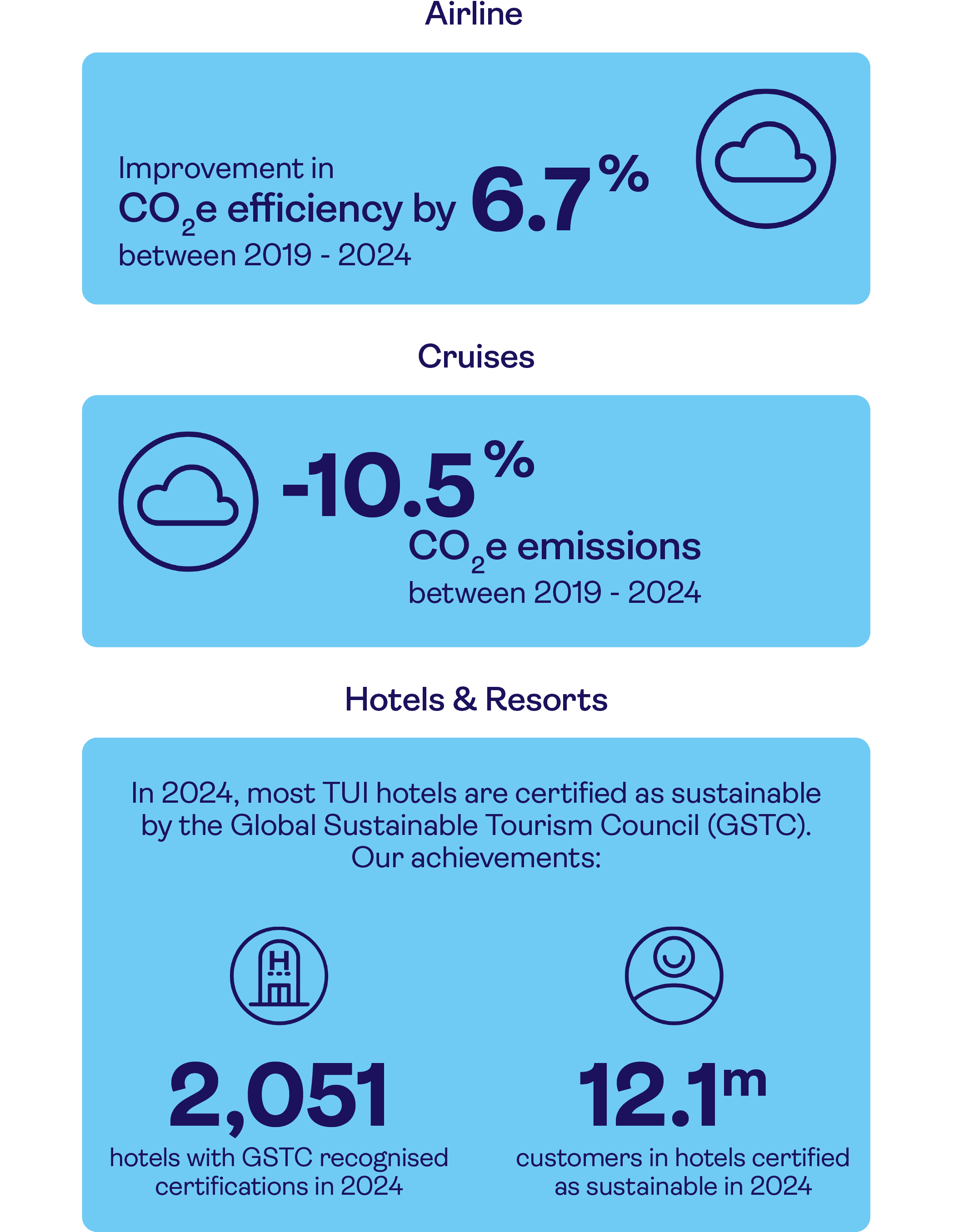 Why are we convinced that we will achieve our emission reduction targets? Because sustainability has been part of our corporate DNA for decades. For example, TUI pioneered with the first sustainability department in the European tourism industry over 30 years ago. Since then, we have been working hard to reduce the environmental impact of our aircraft and cruise fleets, as well as our hotels, offices, and travel agencies. This includes multi-million-dollar investments in state-of-the-art aviation and cruise technologies to improve carbon efficiency. Key performance indicators: