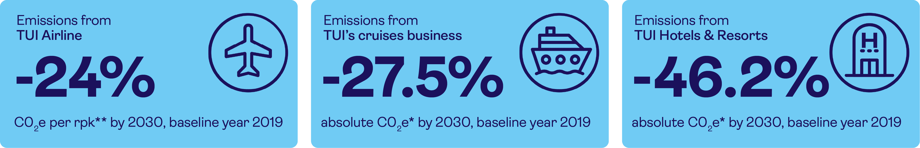 The TUI Group is working to significantly reduce its greenhouse gas emissions in the coming years. As an initial step, we have drawn up concrete roadmaps up to 2030. Emission reduction targets have been reviewed and verified by the independent Science Based Targets Initiative (SBTi) – which is supported by the UN Global Compact and WWF, among others. In accordance with the SBTi's strict catalogue of requirements, the targets are in line with the latest findings of climate science. This made us the first holiday airline, the first cruise line and one of the first holiday hotel brands to have SBTi-validated reduction targets. The targets in figures: